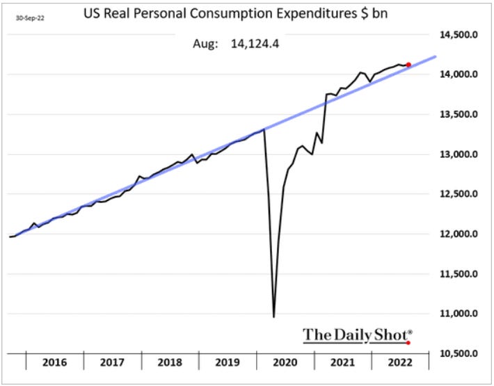 The Fed’s efforts to destroy demand are not working yet. Americans continue to increase their spending. Spending growth is slightly ahead of pre-pandemic levels.