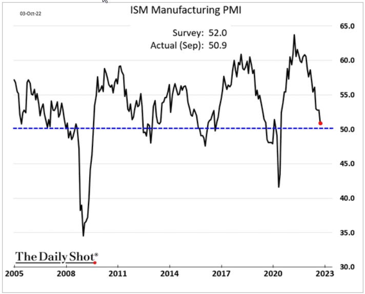 ▼ ISM Manufacturing PMI fell to 50.9 in Sep from 52.8 in Aug (<50 = contraction)