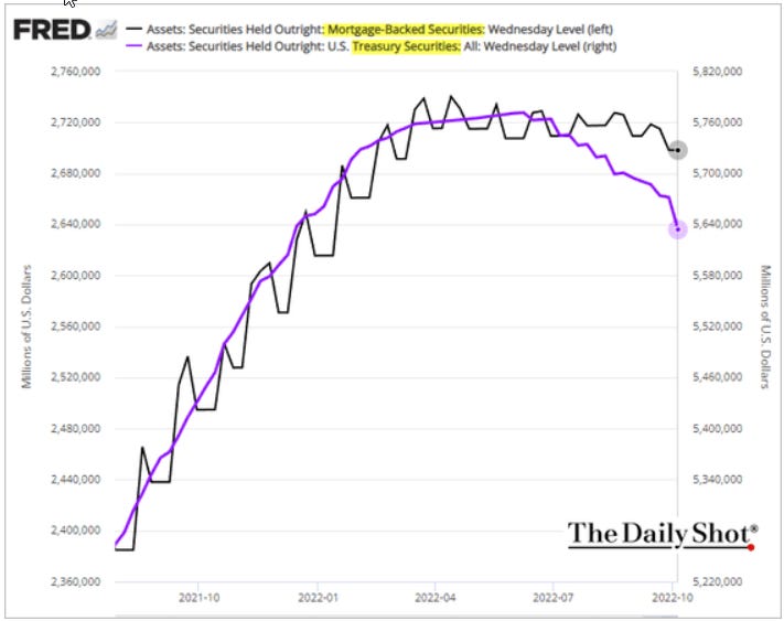 The Federal Reserve is now holding about $8.5 trillion in assets on their balance sheet, $2.70 trillion of MBS and $5.64 trillion of US Treasuries. Six months ago, it was $2.72 and $5.76 trillion, respectively. That’s only a $140 billion reduction — it was supposed to be $333 billion by now, but they haven’t sold any MBS. I suggested in an August post that they would not want to take the loss on selling their low-rate, long-duration MBS into a market where demand for MBS is already very low.