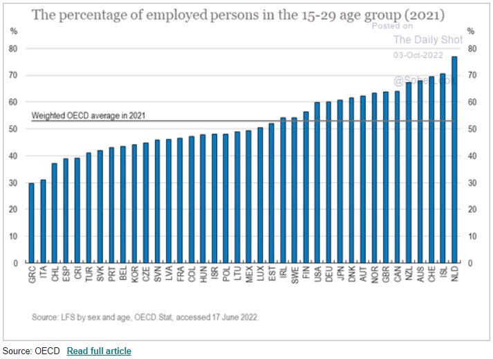 Wages have gone up and the economy is rough, so more youth (15-29 years old) are looking to work. US youth employment at 60% is higher than many countries. High youth unemployment, especially in frontier and emerging economies, is the source of a lot of social discontent and leaves young people vulnerable to recruitment by gangs and terrorist organizations. In the US, job openings fell -11% last week, and with wealth destruction dragging retired people back into the workforce, kids might find themselves competing with their parents for jobs.