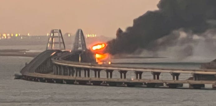 A section of the 12-mile-long Kerch Bridge, the only connection between Crimea and the Russian mainland, was destroyed a few hours ago by Ukraine. The bridge is a crucial route for delivering supplies to Russian troops in southern Ukraine. Several spans in both directions have been destroyed, including the railroad bridge which runs adjacent to the roadway.