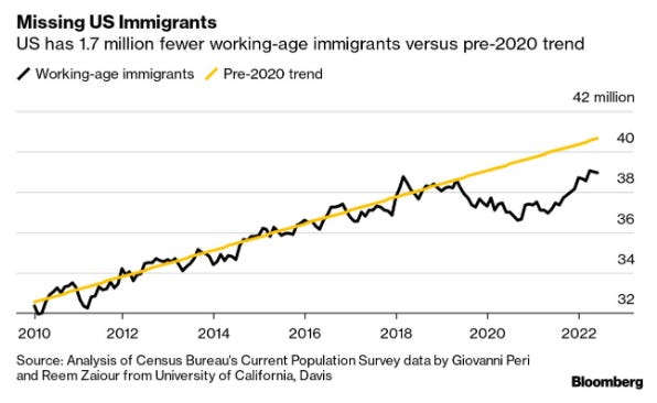 Bloomberg reports that US immigration is rising but still not closing the labor gaps in industries reliant on foreigners like construction, hospitality, and services. Applications are down to just 80% of pre-Covid levels. One reason is that job opportunities at home have improved for them.